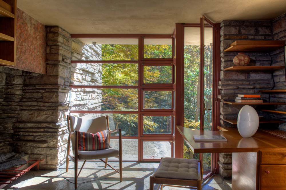 The use of large windows is another key design element of Fallingwater. Wright’s idea was to frame the surrounding nature, creating a living space that would make the occupants feel like they were always in touch with the outdoors. The natural light streaming through the windows also brings the ever-changing colors and textures of the surrounding trees, rocks, and water directly into the home.