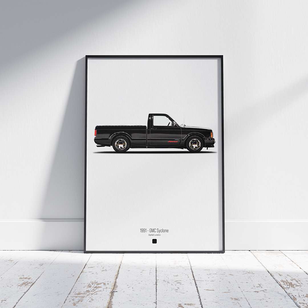 Every piece in this collection is a fusion of minimalist design, retro-modern aesthetics, and pure automotive passion. The 1991 GMC Syclone Poster is a bold yet elegant addition to any wall.