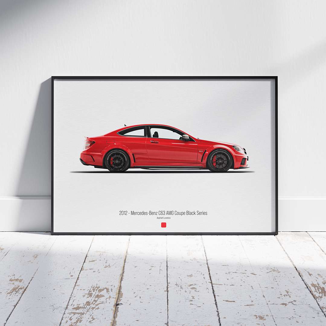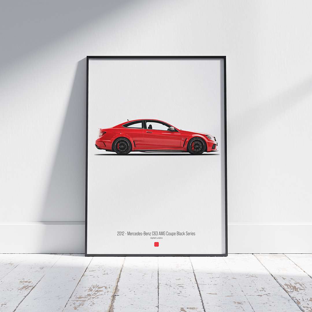 Minimal automotive art of 2012 - Mercedes-Benz C63 AMG Coupe Black Series from the Asphalt Lunatics collection; sharp lines and a bold visual statement.